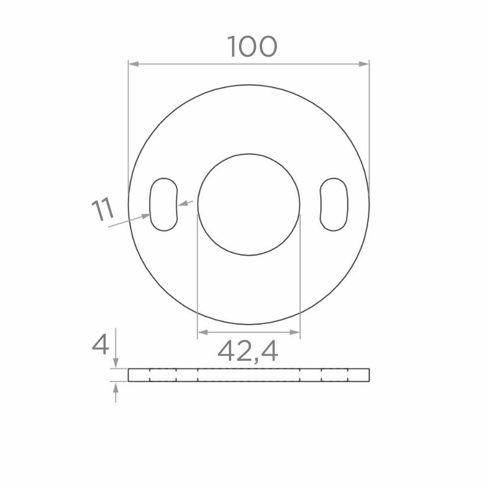 La base est destinée au soudage — le poteau tubulaire de diamètre 42,4 mm s'insère dans le trou central et se raccorde de manière permanente par soudure, ce qui garantit une stabilité et une résistance maximales de toute la construction. Deux trous de montage oblongs (boutonnières) permettent de visser la base au support avec une certaine tolérance de positionnement, ce qui facilite un montage précis même en cas de petites irrégularités.