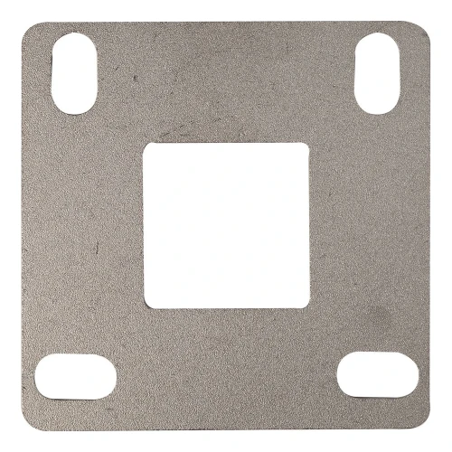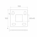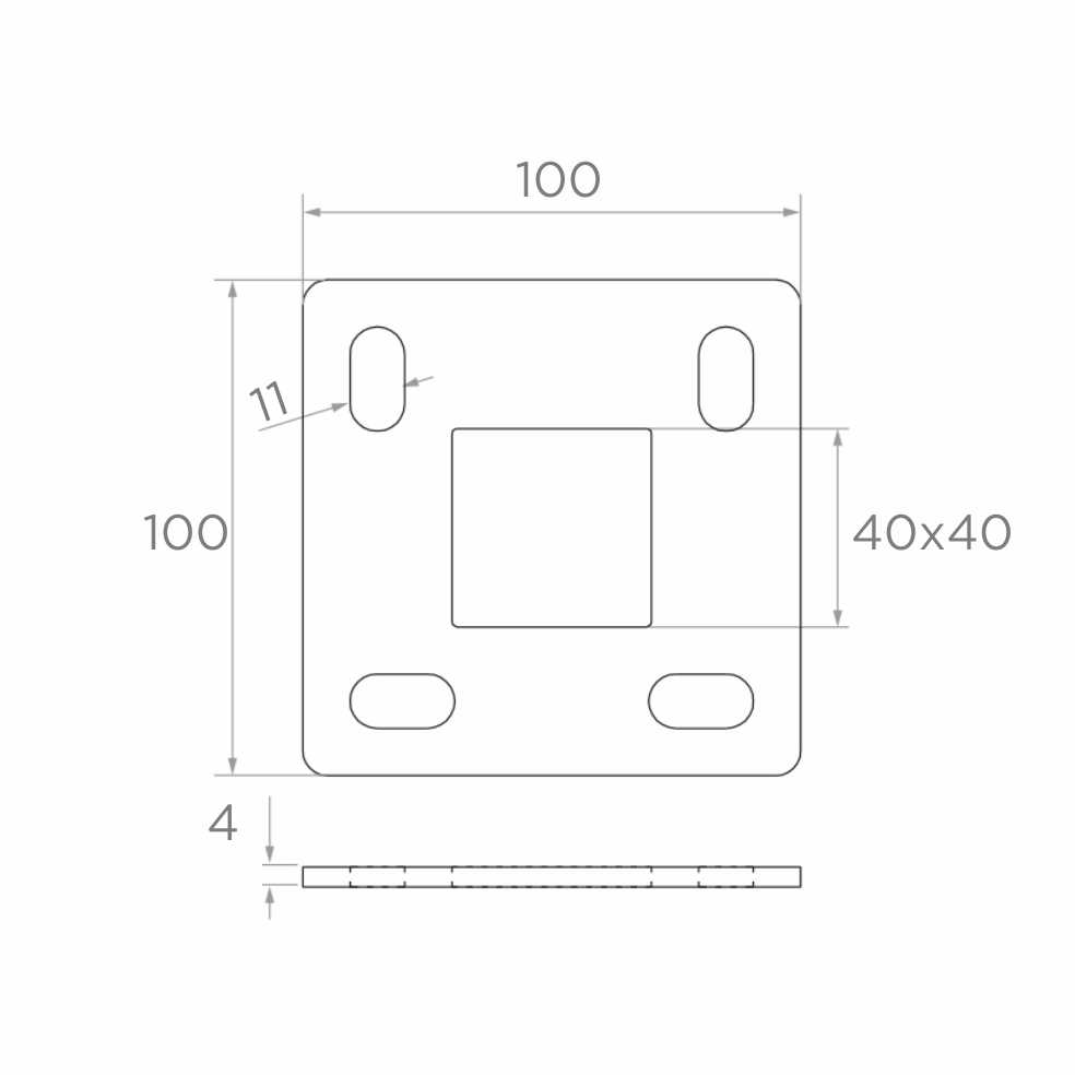 La base possède un trou central carré 40x40 mm adapté au profil du poteau ainsi que quatre trous de montage de type oblong (11x20 mm), qui permettent un réglage précis de la position lors du vissage au sol. La surface brute (sans traitement supplémentaire) permet le soudage sans nécessité de retirer les revêtements — prête à l'emploi dès la sortie de l'emballage.