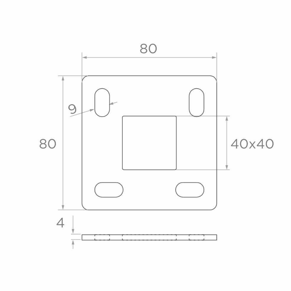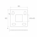 Quatre orifices de montage ovales (9×20 mm) assurent une flexibilité lors de l'ancrage au support - le réglage de la position des vis facilite le positionnement précis du poteau même sur des surfaces irrégulières. L'orifice central 40×40 mm est adapté au système standard de profilés carrés, ce qui garantit la compatibilité avec les poteaux de balustrade populaires.