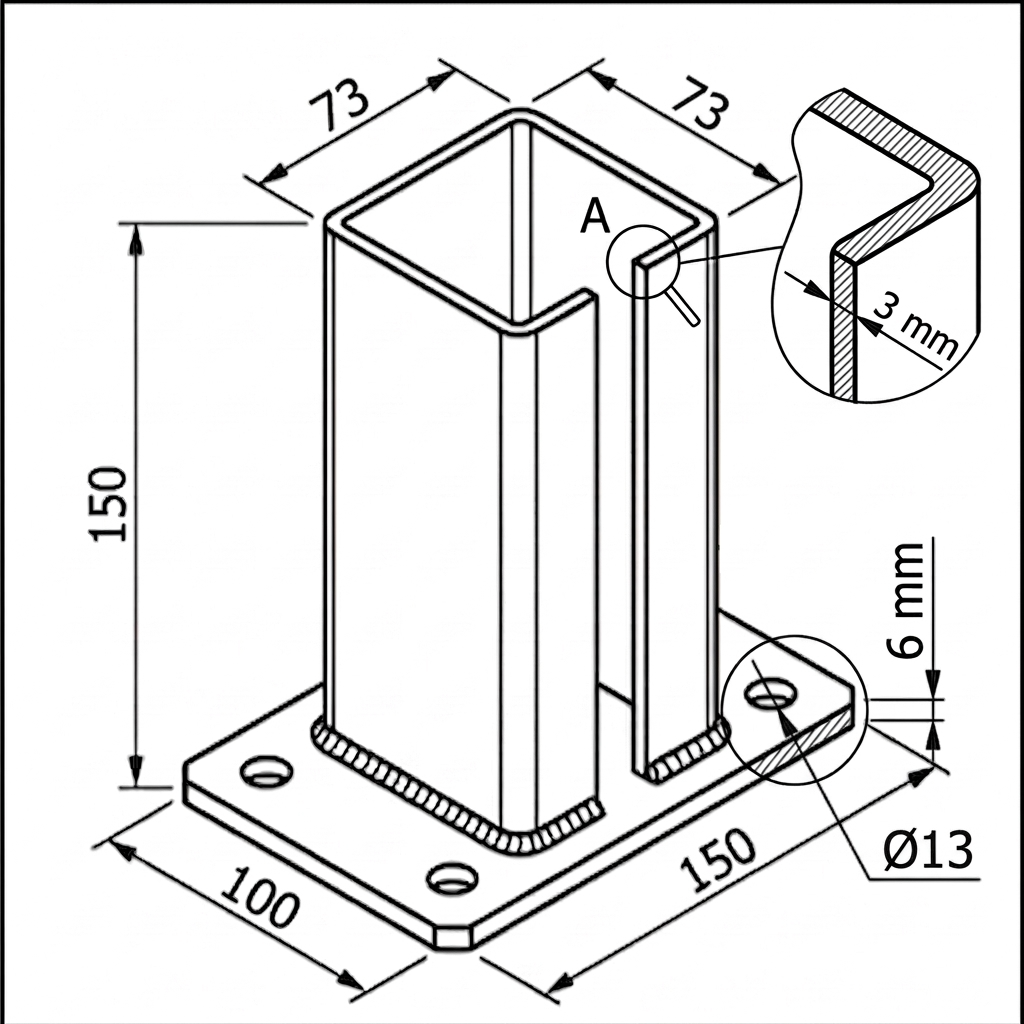 La construction se compose d'un profil carré ouvert 73×73 mm (adapté au poteau 80×80 mm) soudé à une plaque de montage massive avec quatre trous pour boulons d'ancrage. La soudure d'angle à la base du profil garantit un transfert solide des charges. La fente verticale dans le profil permet un ajustement précis et la compensation des tolérances du poteau.