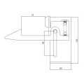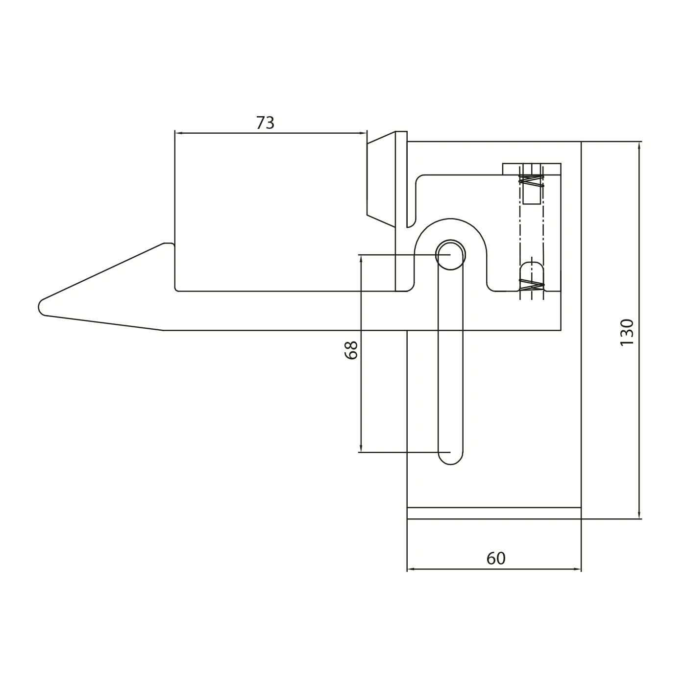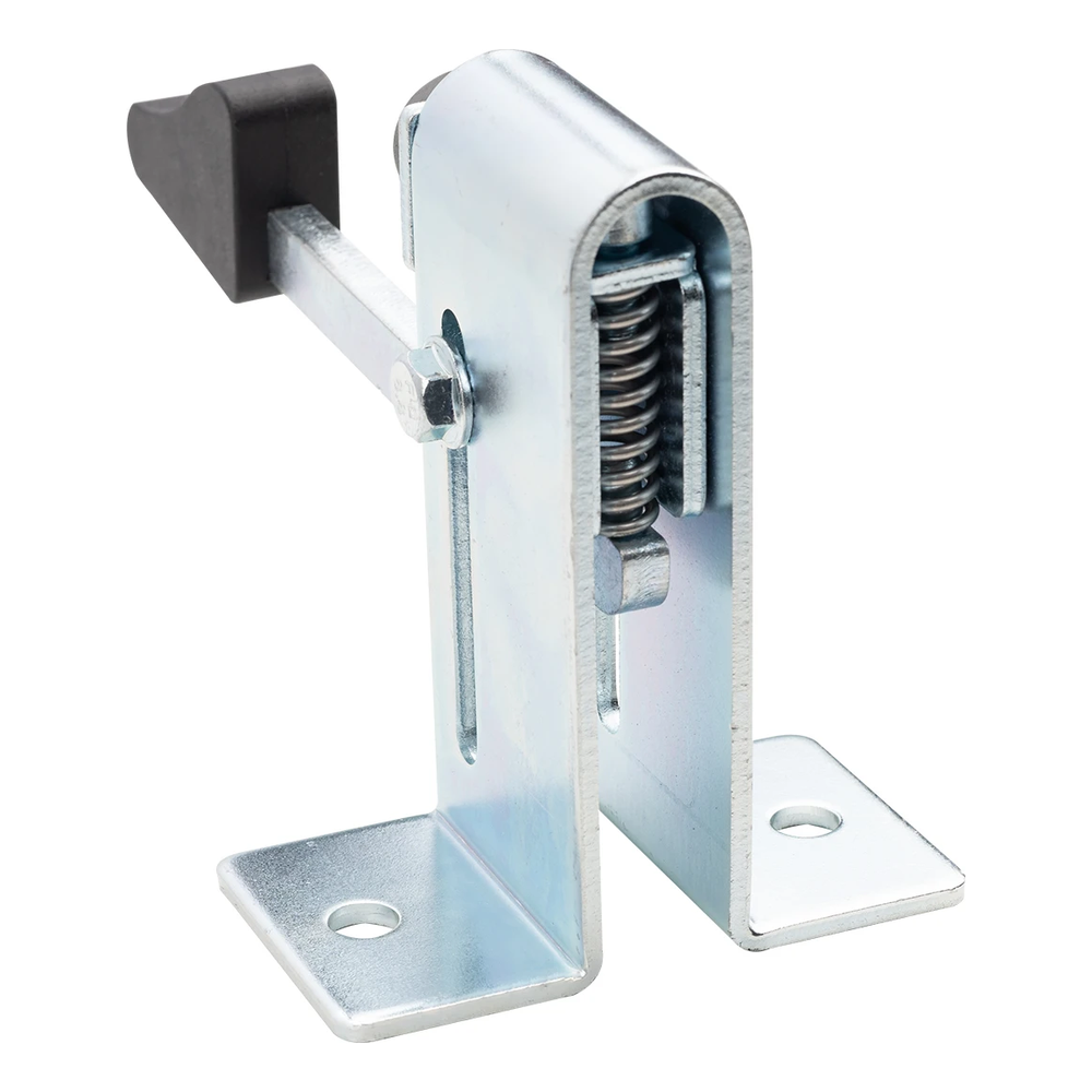 À l'intérieur du corps se trouve un mécanisme à cliquet à ressort, visible sur la photo arrière du produit. La goupille en acier se déplace le long de la découpe dans le corps (plage de mouvement 68 mm), et le ressort la maintient en position bloquée. Le déclenchement noir au pied permet une libération intuitive du blocage — il suffit d'appuyer avec le pied pour que le vantail du portail puisse se fermer librement.