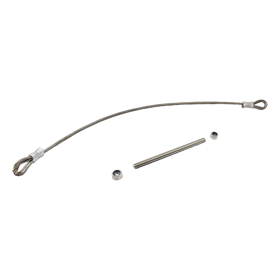 Le kit est prêt au montage — il contient un câble en acier avec des œillets sertis en usine aux deux extrémités, une tige filetée M12 d'une longueur de 180 mm ainsi que deux écrous auto-freinés M12. Grâce à cela, l'installateur n'a pas besoin de compléter séparément les éléments de fixation, ce qui accélère l'exécution de la commande.