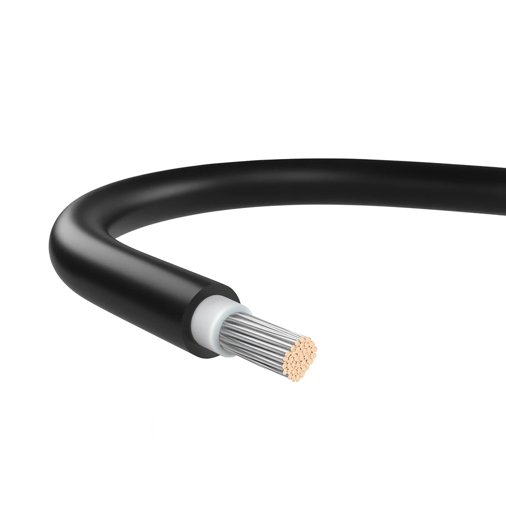 Le câble photovoltaïque H1Z2Z2-K 1x10 mm2 de couleur noire est un élément fiable de toute installation PV. Grâce à son conducteur en cuivre étamé d'une section de 10 mm2, il garantit de faibles pertes de transmission même sur de longues distances de câblage – des strings de modules jusqu'à l'onduleur.