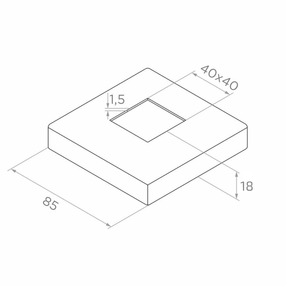 Cache-trou carré 85×85 mm en acier inoxydable AISI 304 avec finition satinée — élément de masquage esthétique destiné à recouvrir les trous de montage dans les balustrades inoxydables avec profil 40×40 mm. Grâce à l'emboutissage précis et à la surface satinée, la rosace s'intègre parfaitement à la construction de la balustrade, lui donnant une finition professionnelle et soignée.