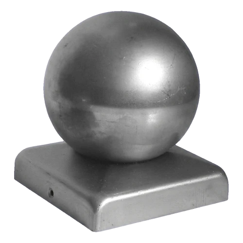 Capuchon d'escrime en acier avec boule décorative destiné à la finition et à la protection des poteaux de section 60×60 mm. La boule de diamètre ø 50 mm donne à la clôture un caractère esthétique et représentatif, tout en constituant une barrière efficace contre la pénétration d'eau à l'intérieur du poteau. Produit livré à l'état brut — permet toute finition de peinture adaptée à la couleur de la clôture.