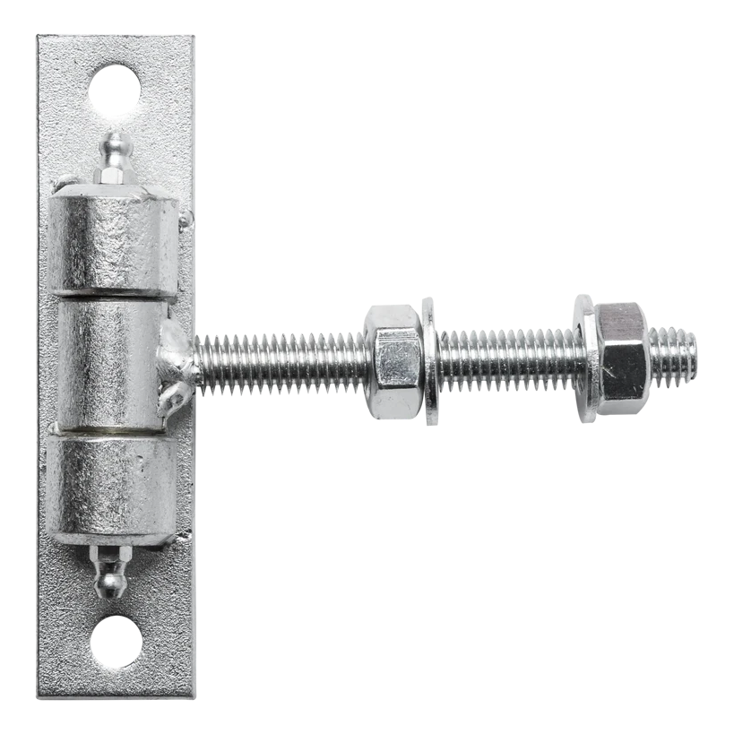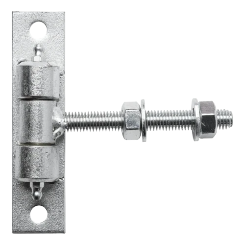 Charnière réglable avec filetage M12 destinée au montage de portails à battants et portillons. Construction solide en acier galvanisé assurant une haute résistance à la corrosion et une exploitation de longue durée dans des conditions extérieures. Grâce à l'écrou de réglage sur la tige filetée, il est possible de corriger à tout moment le positionnement du battant — directement après le montage comme plus tard, par exemple après affaissement de la construction ou déformations thermiques à des températures extrêmes.