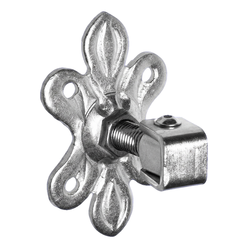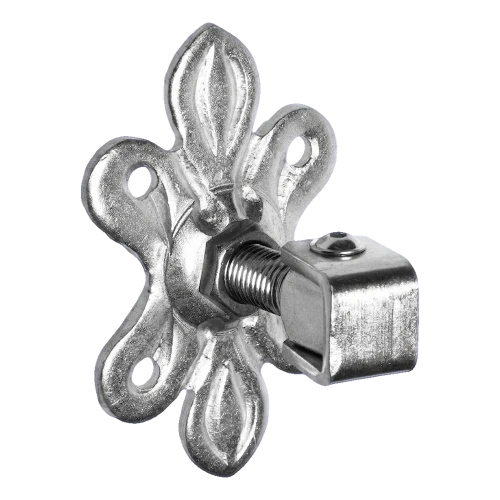 La plaque décorative en forme de fleur de lys héraldique donne à la charnière un caractère esthétique et décoratif — idéal pour les portails et portillons où comptent non seulement la durabilité, mais aussi l'apparence de la quincaillerie. Quatre trous de montage dans la plaque assurent une répartition stable et uniforme des charges sur la surface du poteau ou du battant.