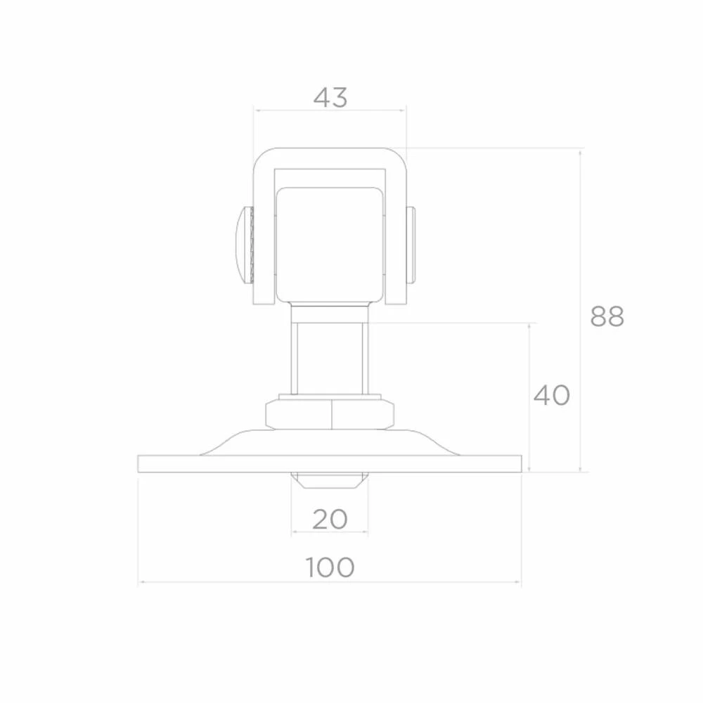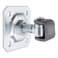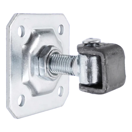 La charnière est destinée au montage sur les piliers de portails battants — en acier, maçonnés ou en béton. Quatre trous de montage dans la plaque (Ø 10,5 mm) permettent une fixation sûre au support à l'aide de vis ou d'ancrages appropriés. Après avoir fixé la plaque sur le pilier et l'œillet sur le vantail du portail, il suffit de serrer l'écrou de réglage sur le filetage M20 pour régler la position désirée du vantail. Le réglage peut être répété plusieurs fois — ceci est particulièrement utile en hiver, lorsque le métal se contracte sous l'effet des basses températures, et en été, lorsqu'il se dilate thermiquement.
