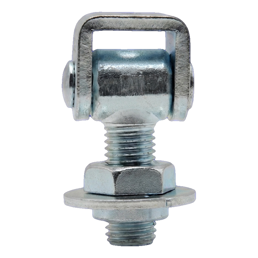 La charnière se compose d'une oreille avec axe de rotation et d'une tige filetée M20 avec écrou de réglage et rondelle. Le montage consiste à souder la tige au poteau de clôture, ce qui garantit une fixation stable et durable éliminant le risque de desserrage pendant l'exploitation. Une paire de charnières supporte une charge jusqu'à 105 kg sur un battant de 2 m de longueur, ce qui les rend appropriées aussi bien aux portillons légers qu'aux portails industriels lourds.