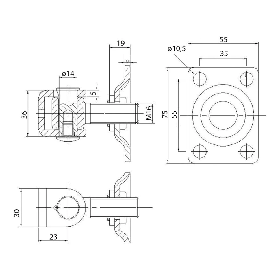 Charnière réglable M16 avec platine rectangulaire 75×55 mm