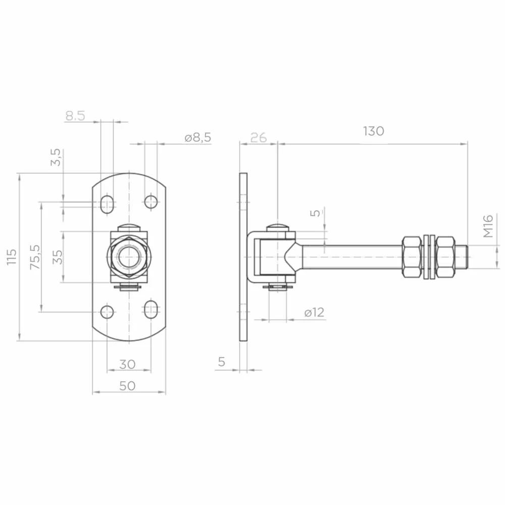 Charnière réglable de portail M16 avec plaque 115×50 mm – galvanisée