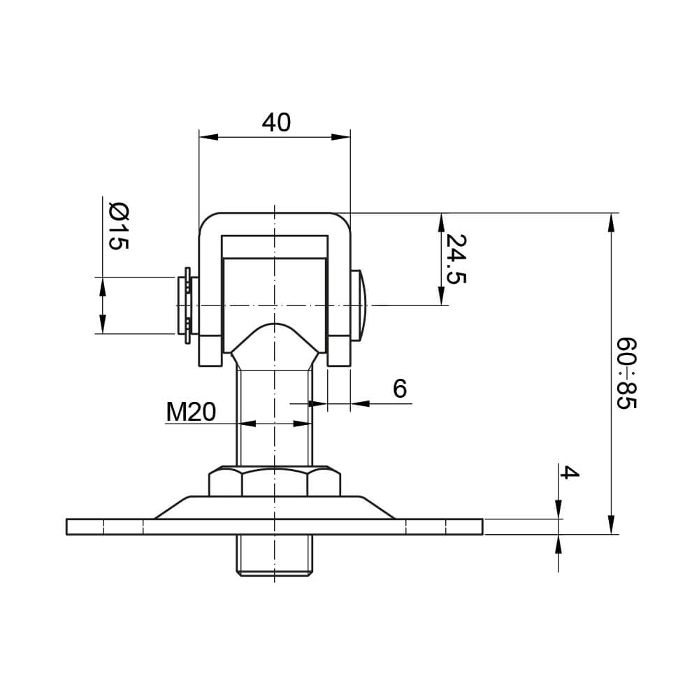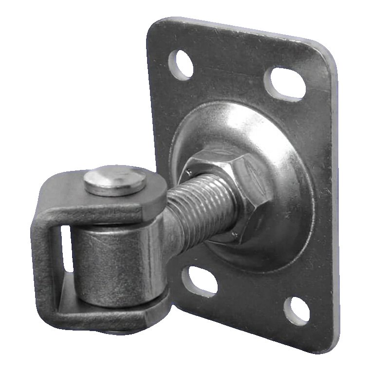 Charnière réglable en acier M20 avec base de montage et oreille type haricot — solution solide et pratique à régler pour le montage de portails battants et de portillons. Le filetage M20 assure une grande capacité de charge et un réglage facile de la hauteur de suspension du battant même après la fin du montage, permettant un nivellement précis du portail sans démontage de la construction.