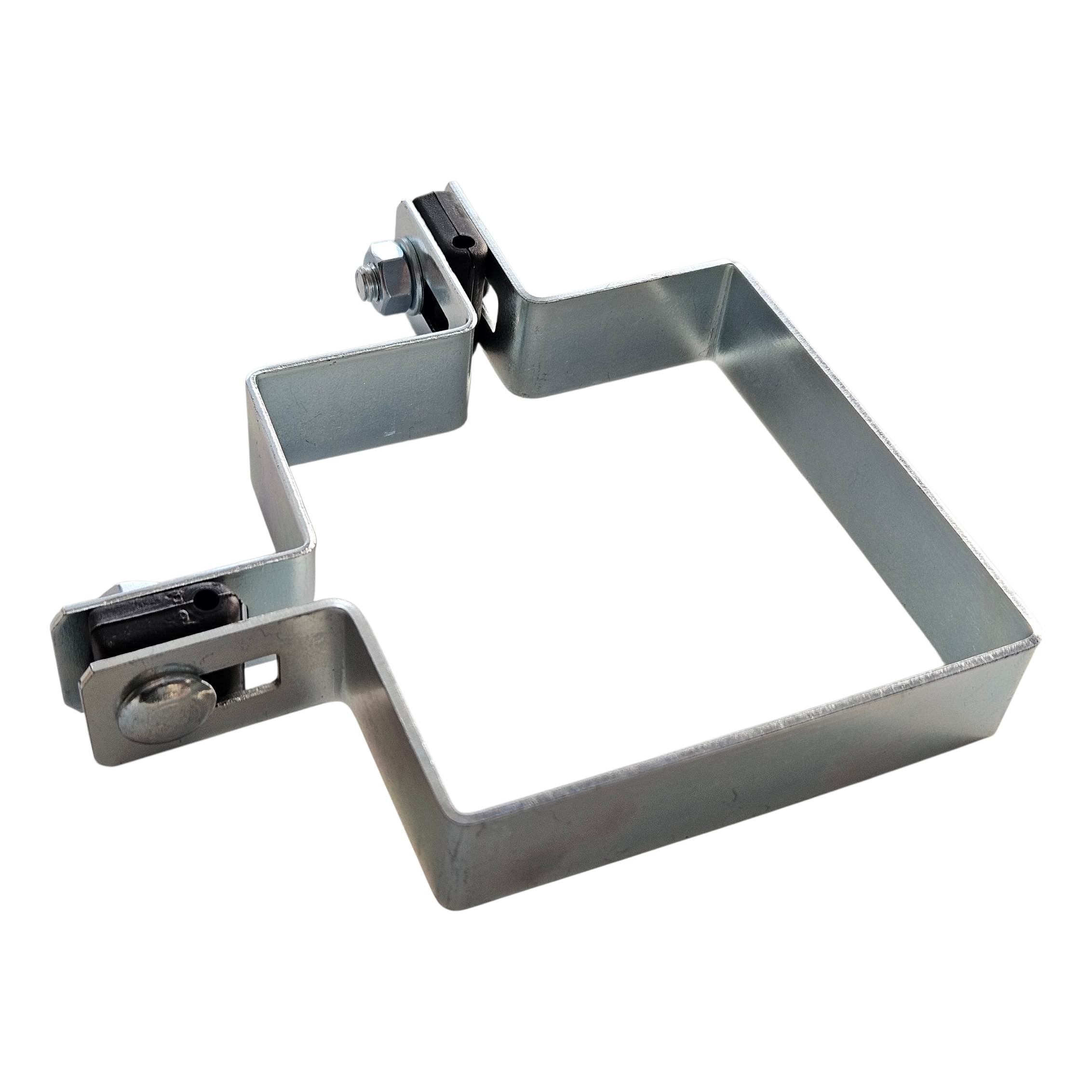 Le collier est parfaitement adapté à la section de poteau 100×100 mm, ce qui garantit une connexion stable et sûre de la structure de clôture. Les trous de montage en forme de haricot permettent le réglage de position du panneau par rapport au poteau — facilitent l'alignement de la clôture même sur terrain inégal.