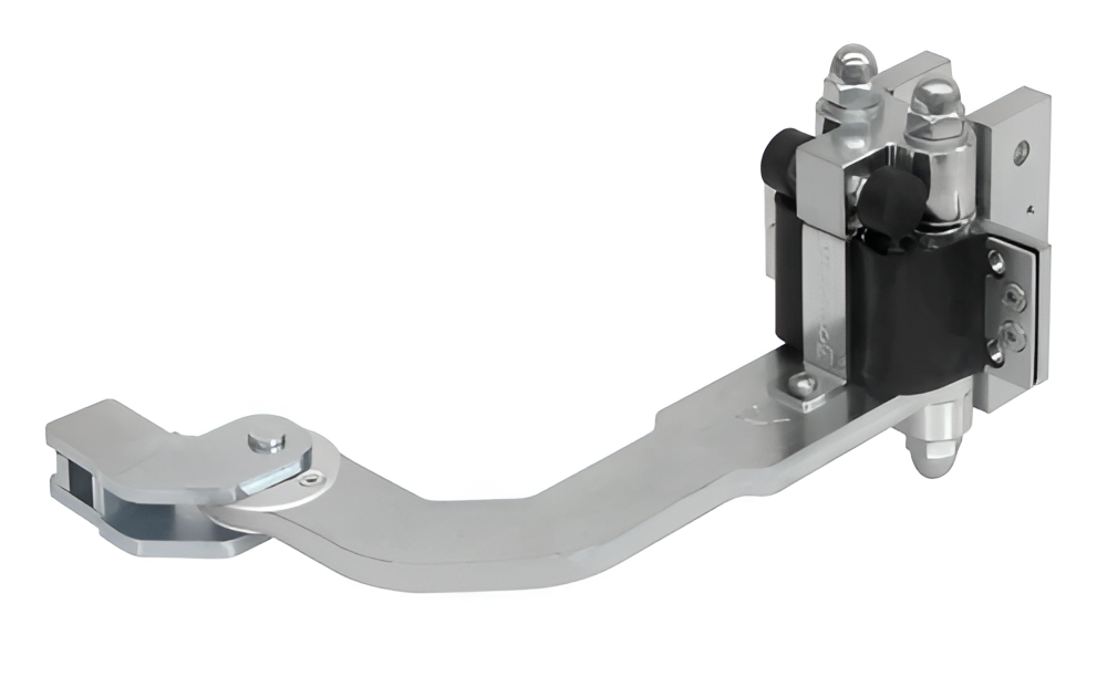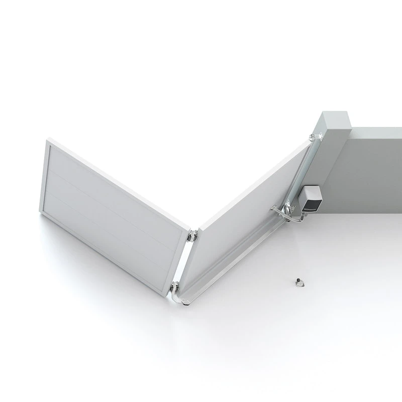 - Charnière inférieure avec transmission et bras — montée dans la partie inférieure du vantail du portail, responsable de l'entraînement du pliage ; le bras de transmission pliable des deux côtés se connecte au bas du premier vantail