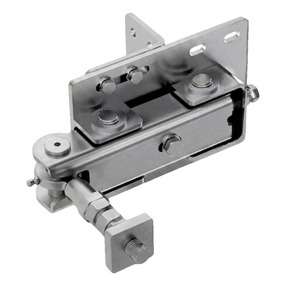 - Charnière supérieure avec transmission — montée dans la partie supérieure du portail près du poteau, synchronise le mouvement des deux vantaux