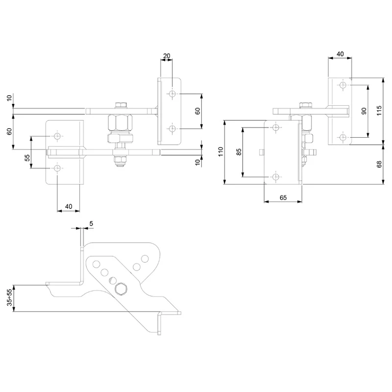 - Entraxe des trous plaque inférieure verticalement : 85 mm (vue droite) / 55 mm (vue gauche)