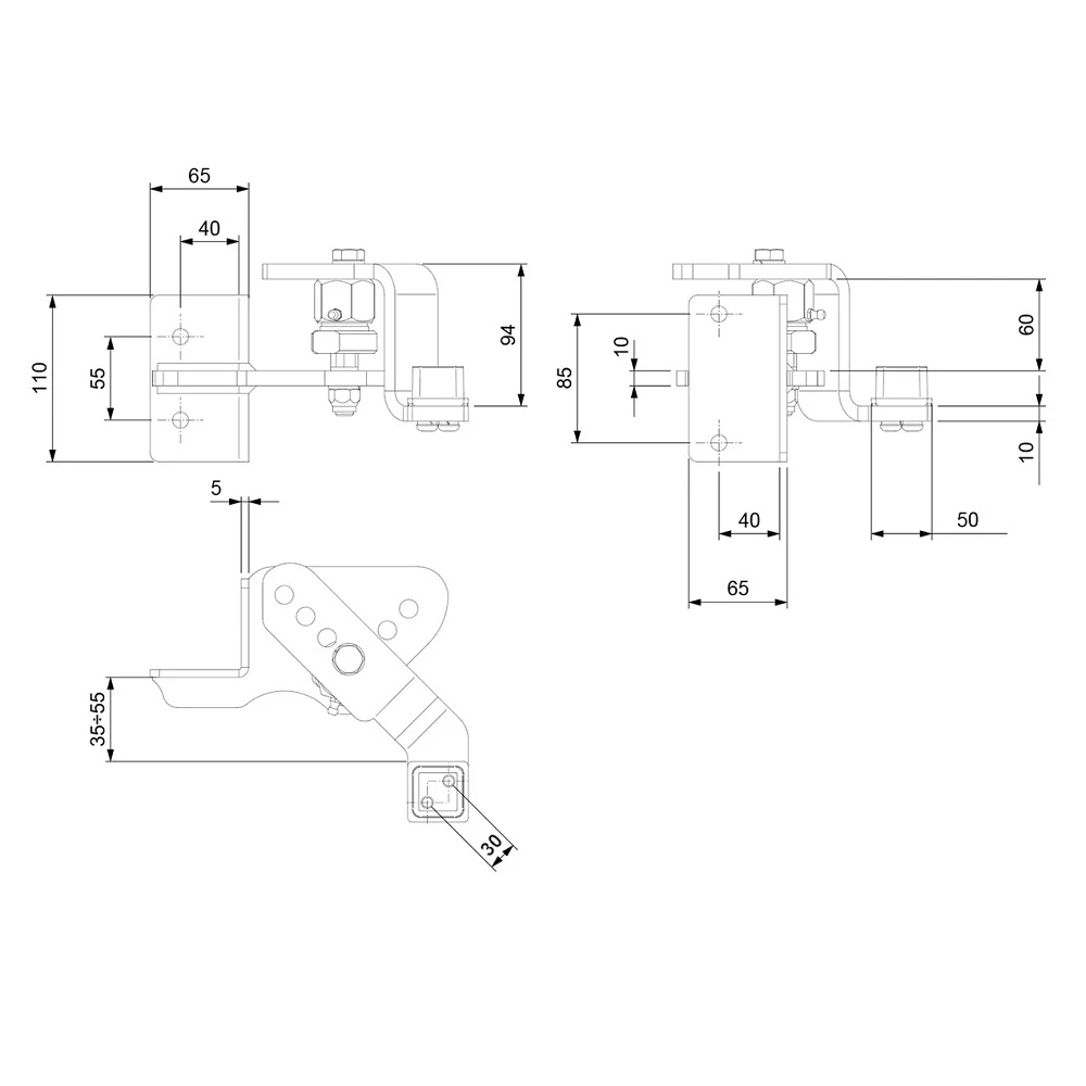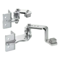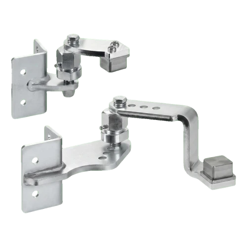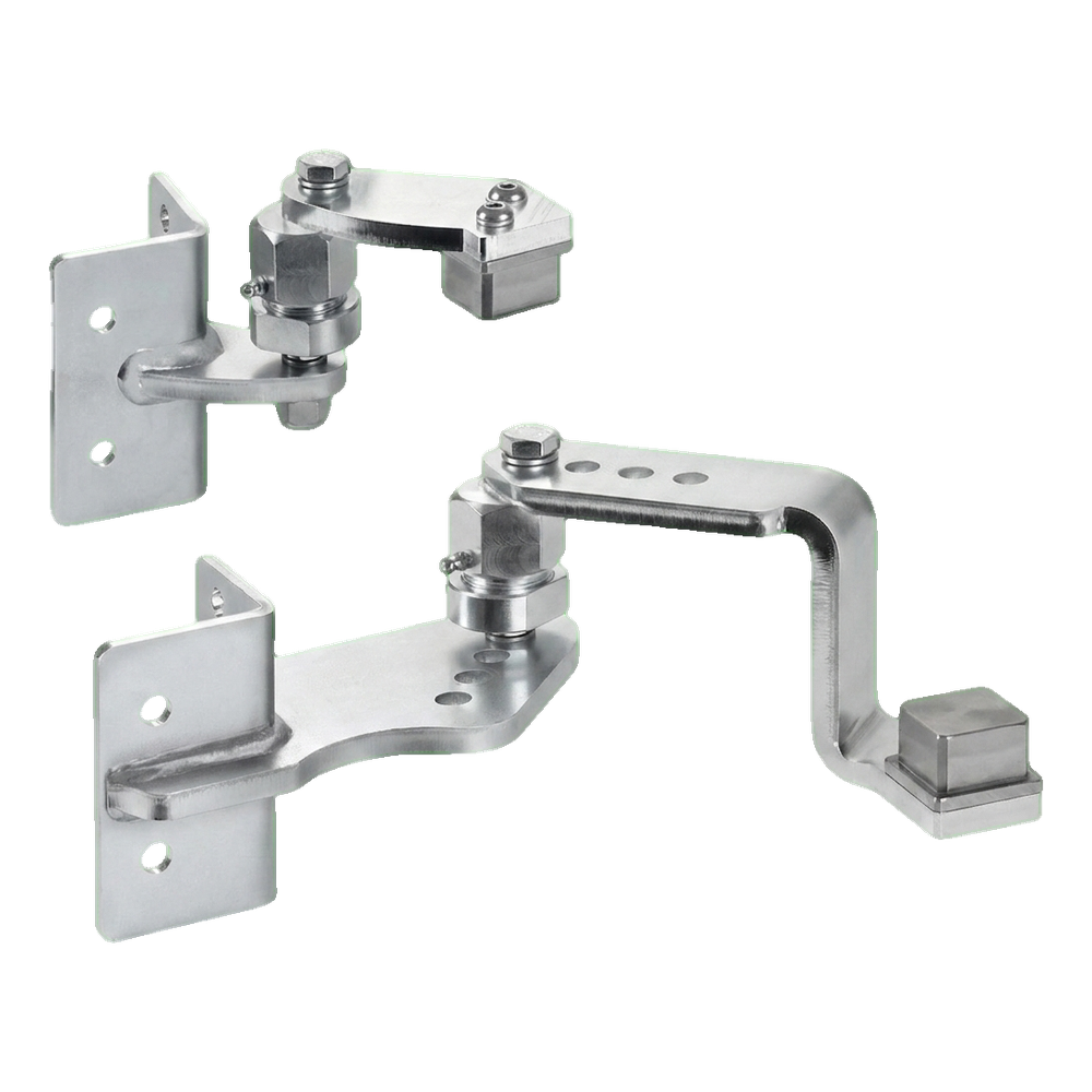 Les charnières sont destinées au soudage sur poteaux en acier 50×50 mm ainsi qu'au montage sur poteaux en béton en utilisant les trous de montage. Le mécanisme articulé avec vis excentrique permet un réglage fluide de l'angle et du niveau du vantail du portail après montage — il n'est pas nécessaire de niveler parfaitement les poteaux lors du bétonnage. Les graisseurs intégrés dans les articulations assurent un entretien facile — il suffit d'un graissage périodique sans nécessité de démonter toute la charnière.
