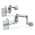 Kit de charnières gauches Comunello à souder destiné au montage de portails battants sur terrains en pente. Le kit permet un réglage précis de la position du vantail grâce à la vis excentrique reliant le support de vantail à l'articulation — la rotation de l'articulation permet d'ajuster parfaitement le vantail à l'horizontale et de l'aligner avec le poteau, même lorsque le terrain est en pente.