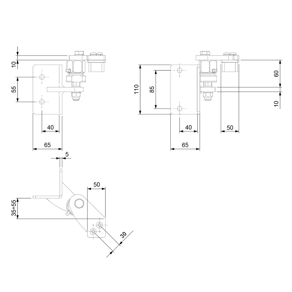 - Entraxe des trous de montage (vertical) : 55 mm (support) / 85 mm (tôle latérale)