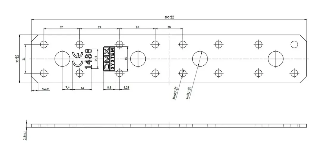 Le connecteur plat LP 200×35 mm est un élément d'assemblage universel destiné aux liaisons en bois, dans lesquelles les faces latérales des éléments à assembler se trouvent dans le même plan. Grâce à la disposition réfléchie de ses 20 trous de différents diamètres, vous pouvez l'utiliser aussi bien dans des assemblages charpentiers standard que dans des structures conçues sur mesure.