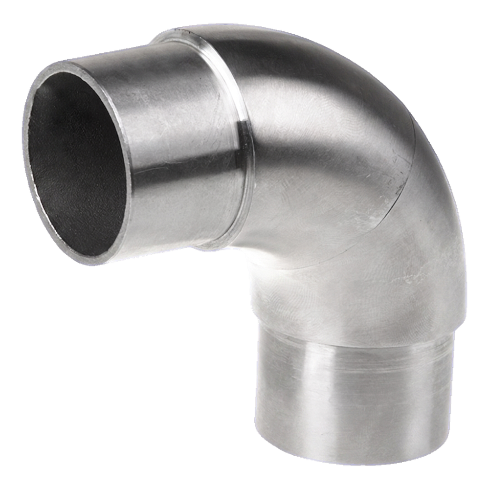 Le coude doux est dédié aux systèmes de balustrades inoxydables basés sur des tubes de diamètre 48,3 mm. Il constitue un raccord esthétique aux endroits où la main courante change de direction à 90° — par exemple dans les virages d'escaliers, sur les paliers ou aux passages entre sections de balustrade. La courbe douce du coude assure un changement de direction fluide, ce qui améliore le confort d'utilisation et la qualité visuelle de toute la construction.