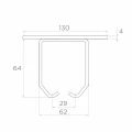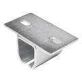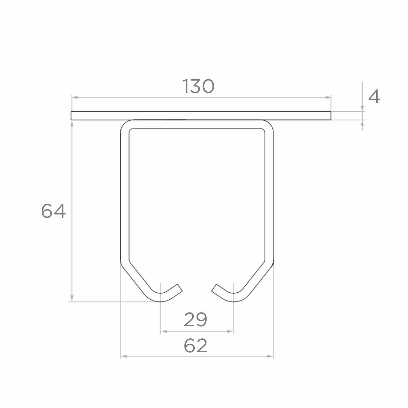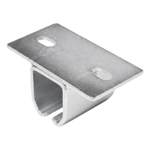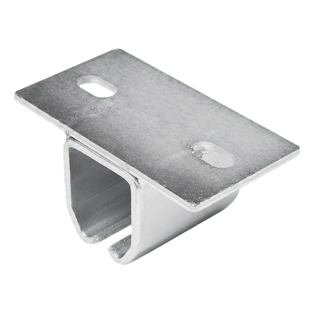 Le crochet possède une plaque de montage plate avec des trous permettant de le visser au plafond ou au profilé porteur. La partie inférieure constitue une attache en forme de C qui entoure le rail de roulement et assure un guidage stable du portail. Le profil du crochet est plié avec précision, et les bords repliés de l'ouverture inférieure augmentent la rigidité de la construction et facilitent l'insertion du rail.