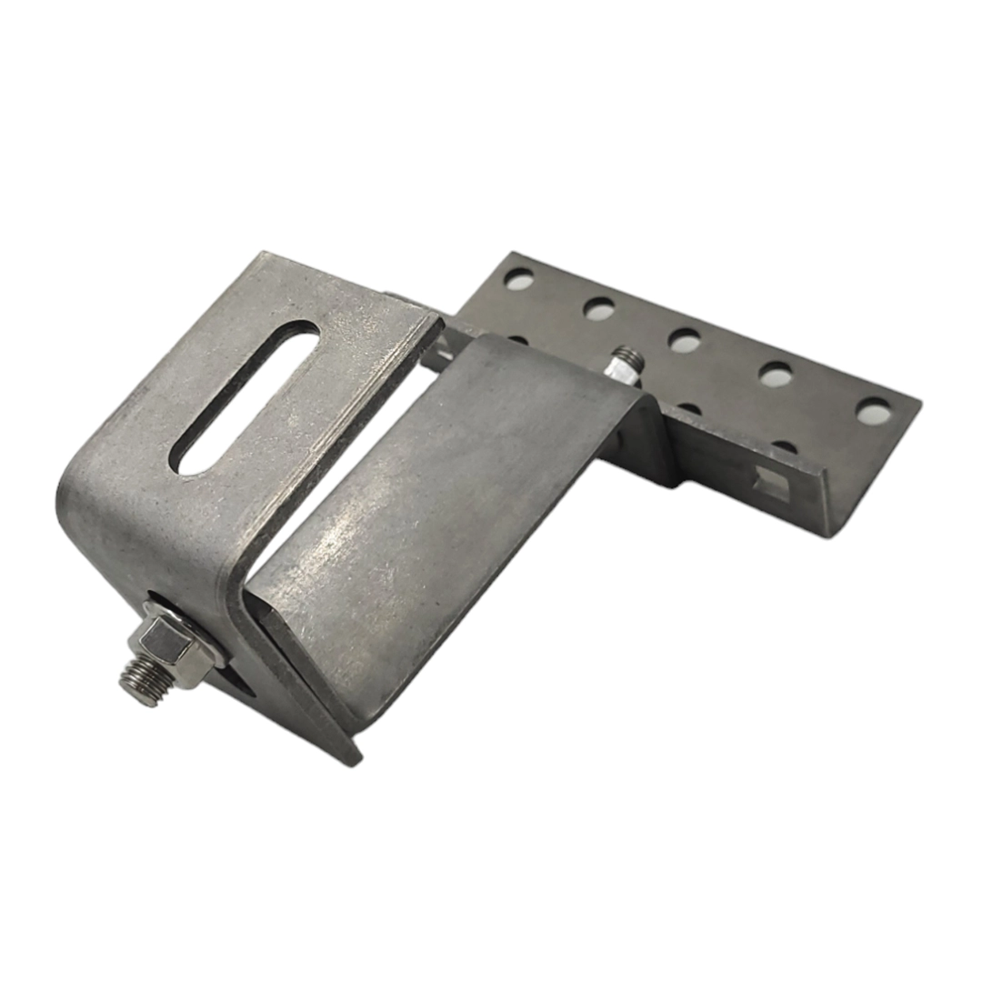 Permet la connexion des profilés avec la couverture de toiture. Le support Vario se monte sur le canal inférieur du rail à l'aide d'une vis. Utilisé là où les supports de toiture standard (sans réglage) sont trop courts.