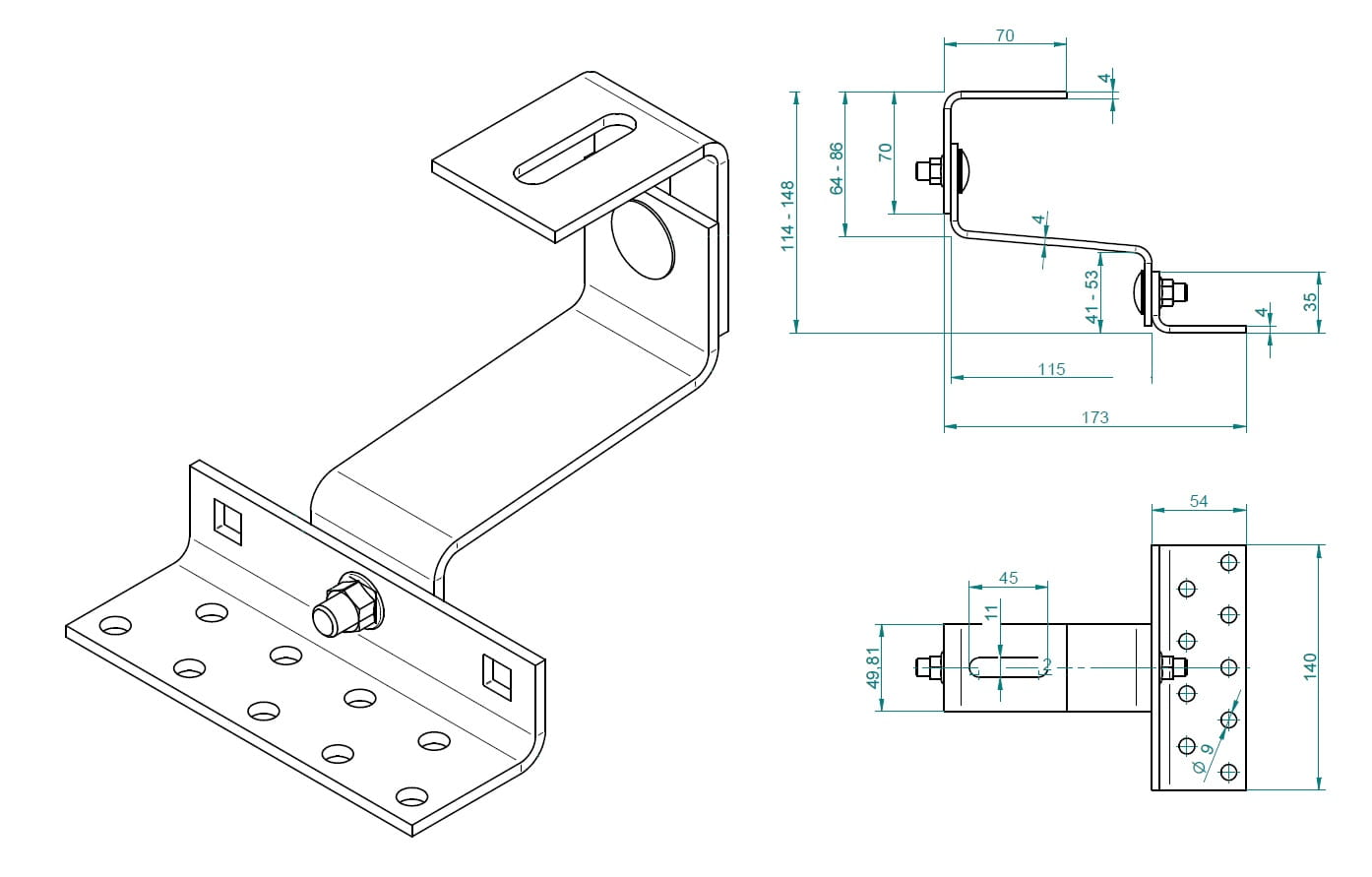- Le support large et réglable est fabriqué en tôle d'épaisseur 4 mm et 5 mm, et l'équerre en plat de 30x5 mm.