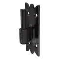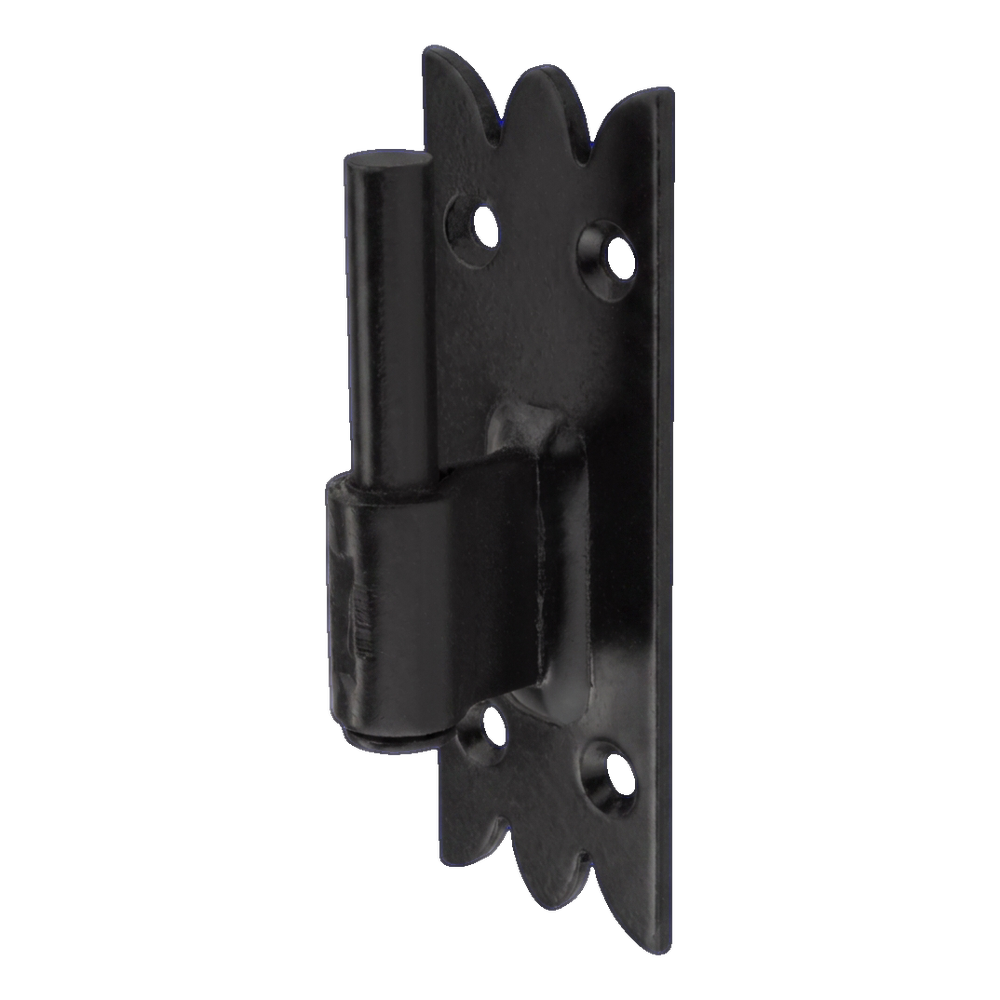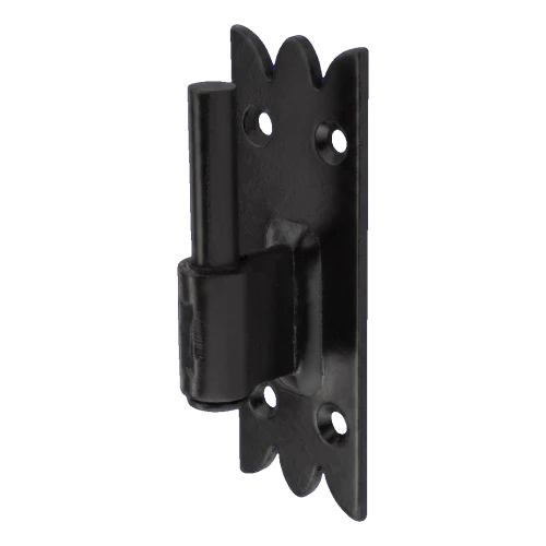 Crochet de volet décoratif pour bâtiment de couleur noire destiné à la connexion mobile des volets au dormant ou au cadre. La plaque de montage décorative avec un motif caractéristique de bords dentelés permet d'intégrer esthétiquement le crochet dans les façades traditionnelles et rustiques. La construction solide en acier galvanisé protégée par une peinture à l'huile assure une haute résistance à la corrosion et aux dommages mécaniques — même dans des conditions atmosphériques exigeantes.