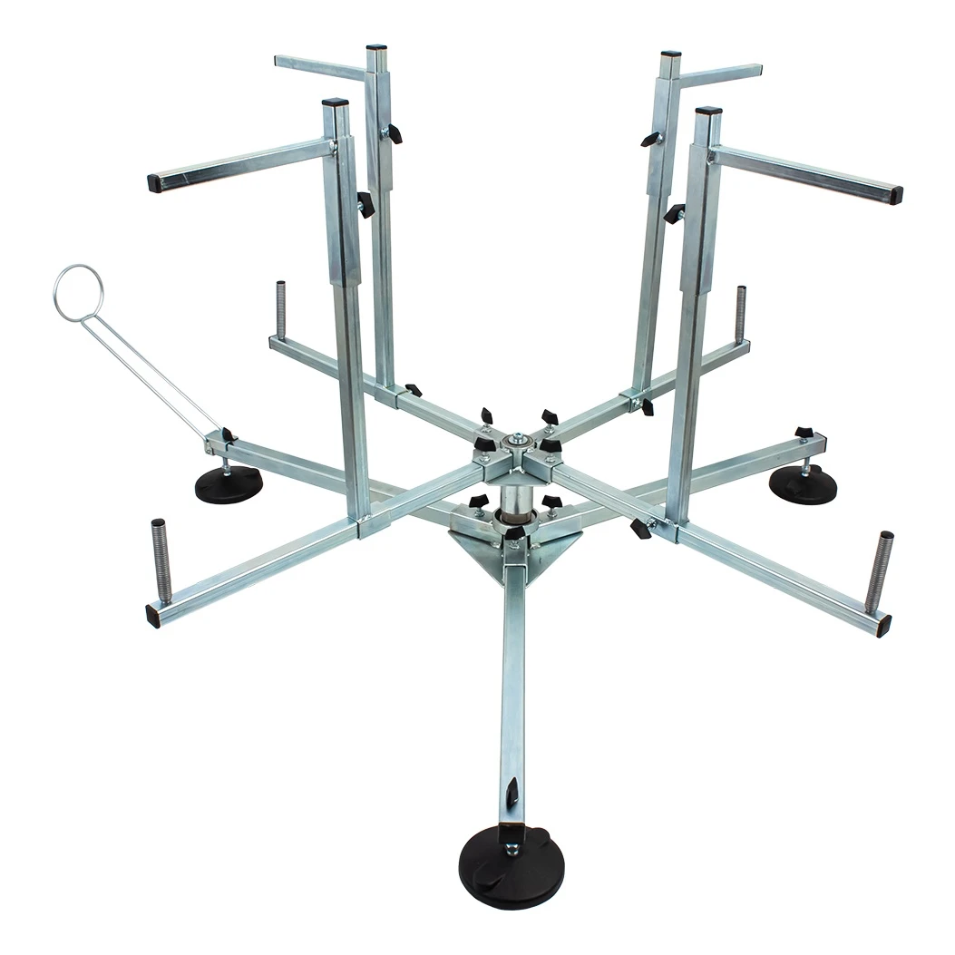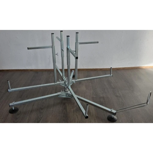 La structure est fabriquée en profilés en acier galvanisé de haute qualité, ce qui garantit une durabilité sur de nombreuses années, même lors d'une utilisation intensive sur les chantiers. La base en étoile stable avec pieds réglables assure un appui solide sur tout type de surface.