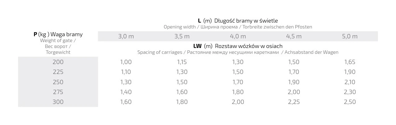 L'entraxe correct des chariots roulants (LW) dépend de la longueur du portail dans l'ouverture (L) et du poids du portail (P). Le tableau ci-dessous présente les valeurs d'entraxe recommandées en mètres, garantissant un fonctionnement optimal et la durabilité du système :