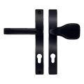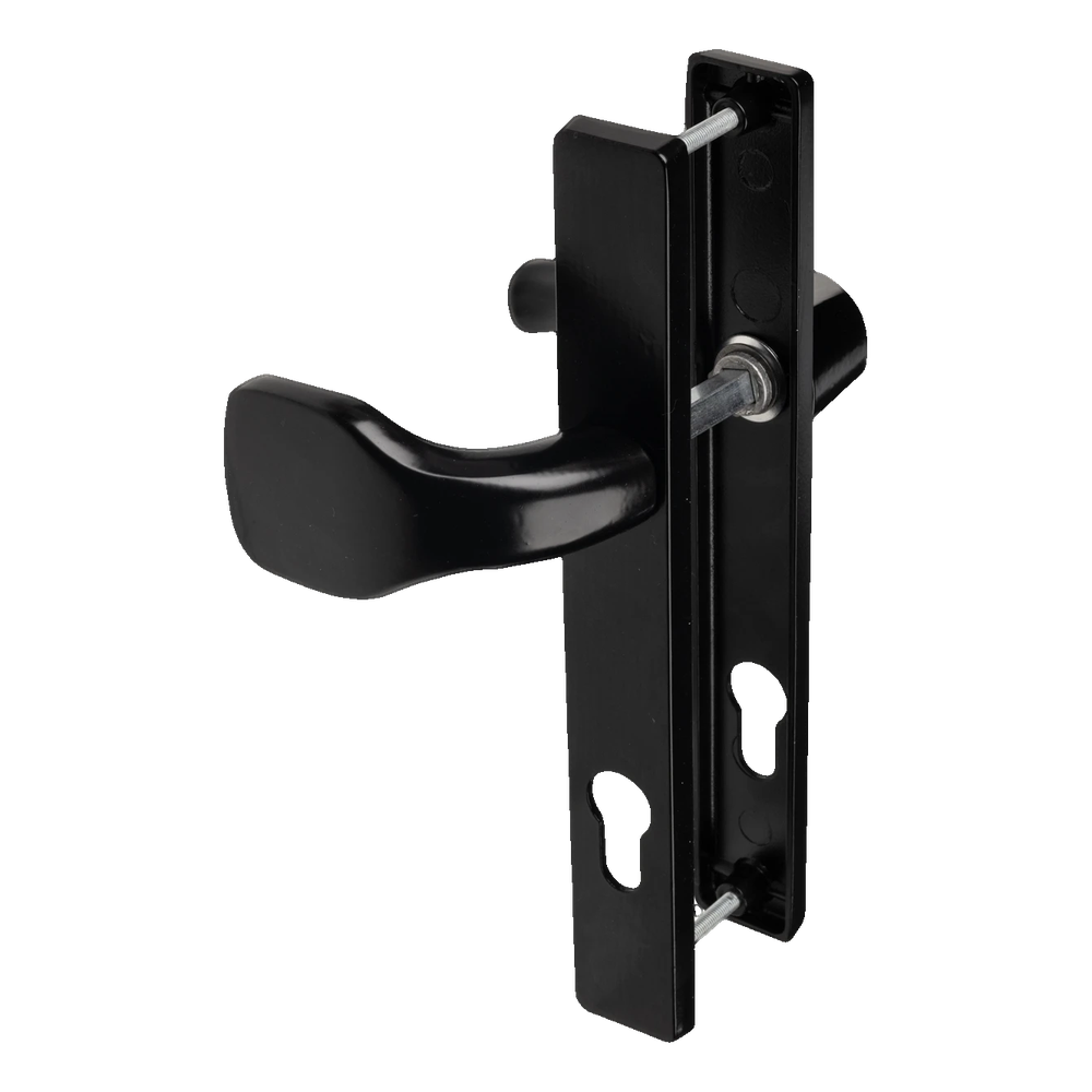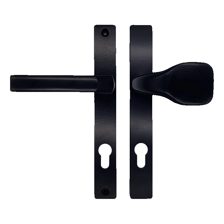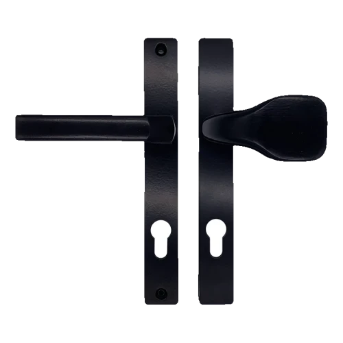 L'ensemble se compose d'une poignée sur plaque d'un côté de la porte et d'un bouton sur plaque du côté opposé — ainsi, de l'extérieur, la porte est actionnée par un bouton pratique, et de l'intérieur par une poignée classique. Les deux plaques sont équipées d'un perçage profilé pour cylindre européen, permettant l'utilisation de toute serrure standard.