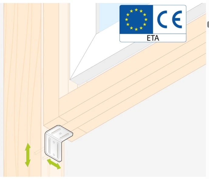 La possibilité de déplacer mutuellement les éléments assemblés fait qu'aucune contrainte due aux déformations thermiques ni aux variations d'humidité du bois n'est générée dans l'assemblage. Les trous oblongs permettent le montage d'éléments atypiques et la compensation de légères tolérances dimensionnelles — vous gagnez du temps sur le chantier et réduisez le nombre de corrections. L'équerre est compatible avec des platines de base rectangulaires ou hexagonales.