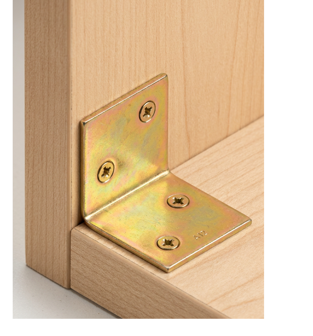 L'équerre de montage large KS1 est un connecteur d'angle universel destiné aux travaux de menuiserie, d'ébénisterie et aux petites constructions en bois. Fabriquée en tôle d'acier DC01 d'une épaisseur de 1,5 mm avec une protection anticorrosion sous forme de galvanisation électrolytique couleur or, elle assure une liaison durable et esthétique des éléments à angle droit.