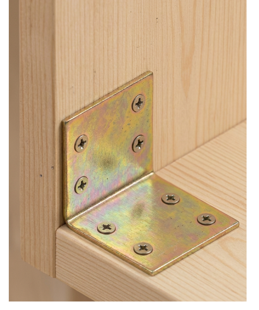 L'équerre se pose à l'aide d'éléments de fixation standard pour le bois. Les trous à fraisage conique permettent un encastrement parfait de la tête de vis, offrant ainsi une finition lisse et esthétique.