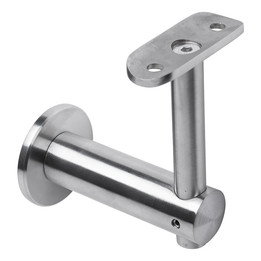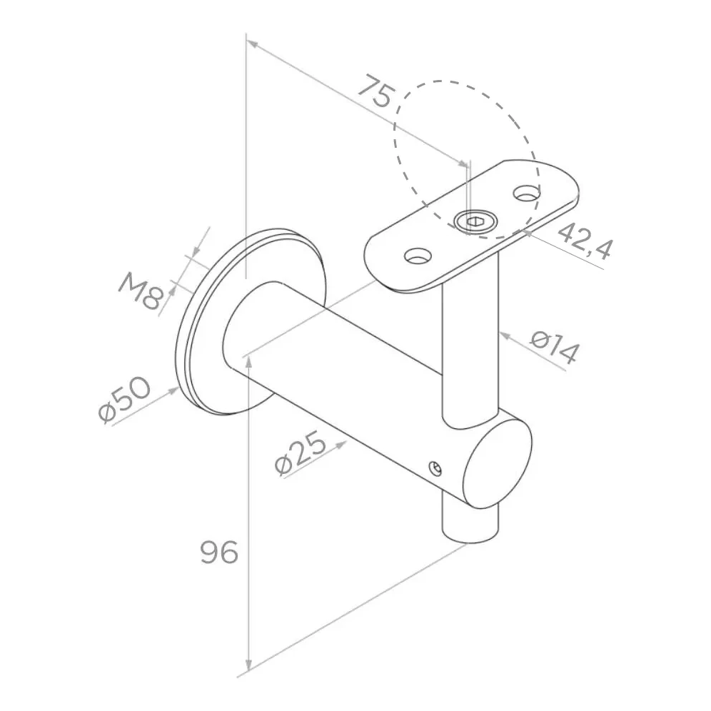 Le support se compose d'une rosace murale d'un diamètre de 50 mm, d'un bras horizontal d'un diamètre de 25 mm et d'un montant vertical avec plaque de montage plate équipée de trous pour visser la main courante. Le filetage de fixation M8 permet un ancrage sûr dans le mur. L'élément s'avère parfait comme couronnement de balustrades en verre ainsi que de systèmes tubulaires classiques — il rehausse les valeurs visuelles de la construction et assure la cohérence de tout le système de main courante.