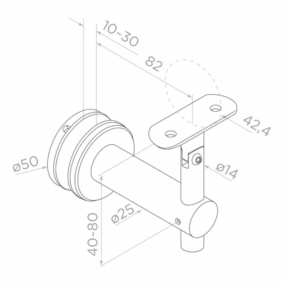 Le support est équipé d'une rotule de diamètre Ø 50 mm avec joints en caoutchouc, qui presse et stabilise la vitre d'une épaisseur de 10 mm à 30 mm (y compris verre feuilleté 10,76–25,52 mm). La large gamme d'épaisseurs supportées permet d'utiliser un seul type de support pour différentes configurations de balustrades — tant avec des vitres trempées qu'avec des vitres feuilletées VSG. Les joints protègent le verre du contact direct avec le métal, éliminant le risque de fissures ponctuelles.