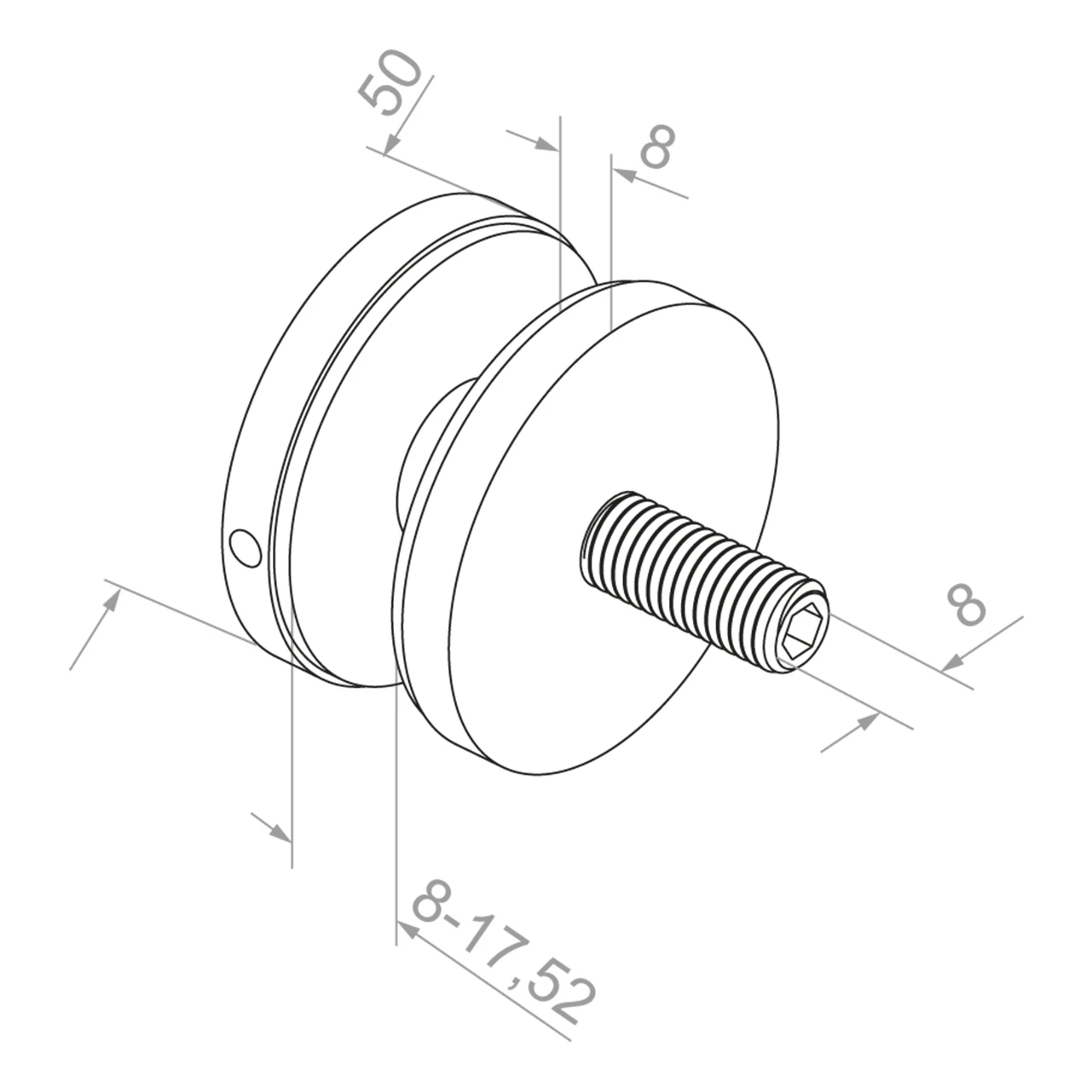 La conception de la fixation permet le montage de verre d'une épaisseur de 8 mm à 17,52 mm, ce qui en fait une solution universelle aussi bien pour les vitrages simples que pour les vitrages feuilletés (ex. verre VSG). La tige filetée M8×45 assure une fixation solide et stable dans le support, tandis que le trou de montage de 16 mm de diamètre facilite une pose précise.