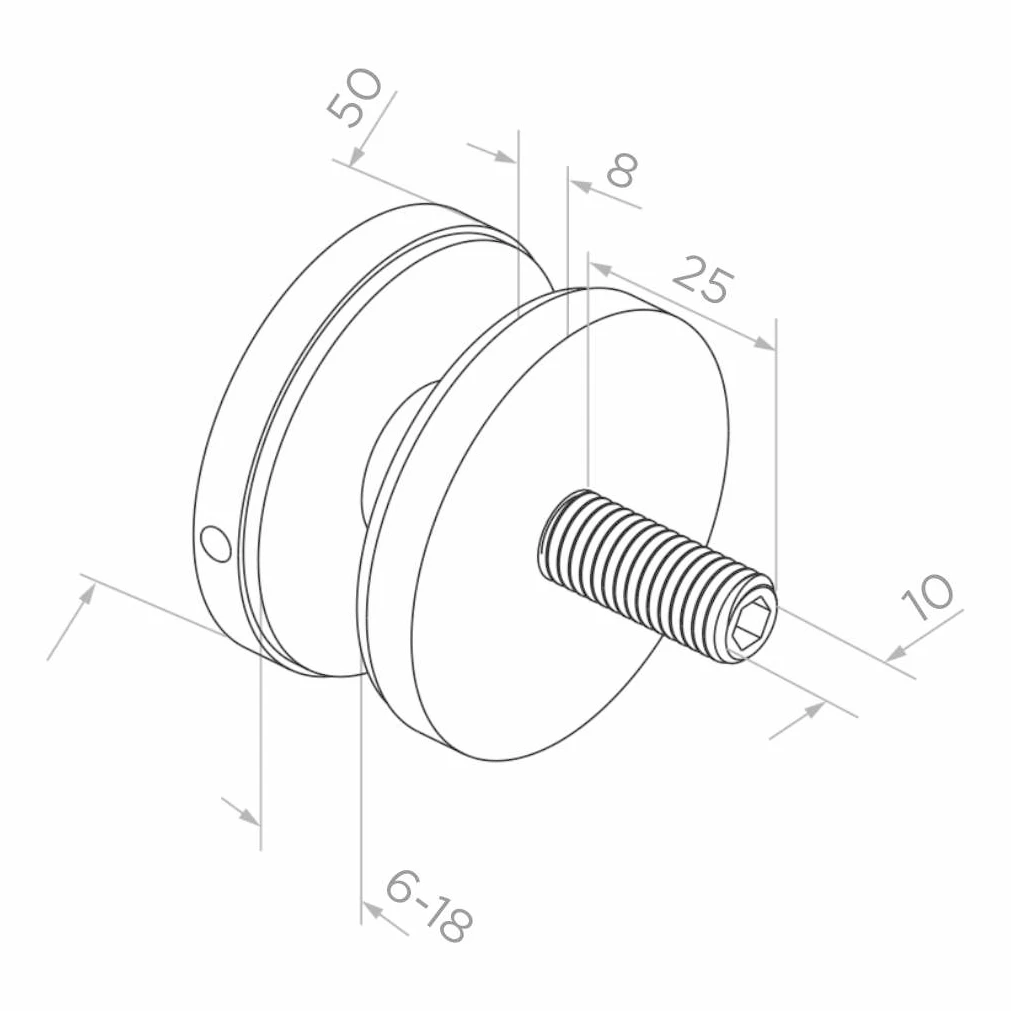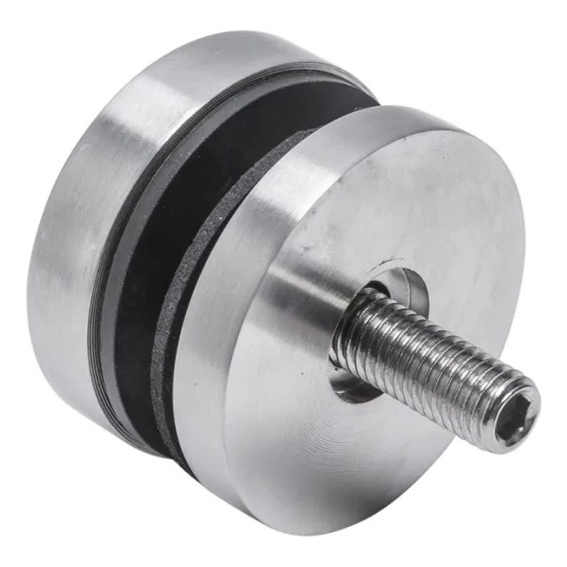 La fixation se compose de deux rondelles de serrage séparées par des joints en caoutchouc, qui protègent le panneau de verre contre les dommages et assurent une pression élastique uniforme. La tige filetée M10 d'une longueur de 25 mm permet une fixation sûre dans une surface plane — cet élément est idéal pour les systèmes de garde-corps en verre, les cloisons, les auvents d'entrée ainsi que les panneaux décoratifs.