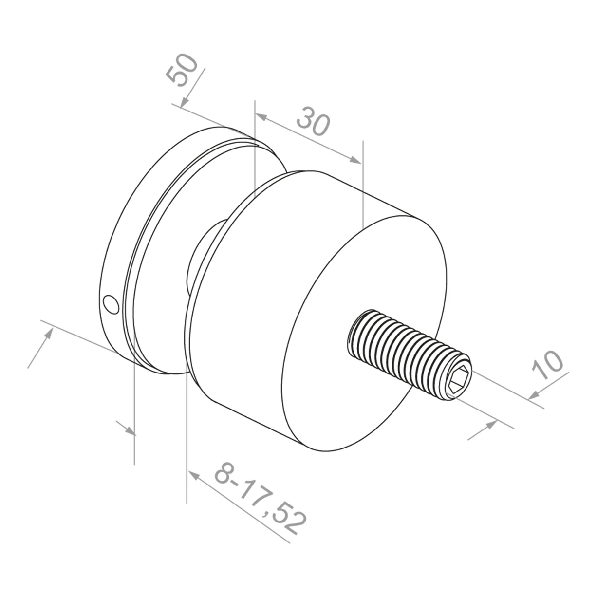 La fixation rotule de diamètre 50 mm permet la fixation de panneaux de verre d'épaisseur de 8 à 17,52 mm, ce qui inclut tant les vitres simples que le verre feuilleté. Le filetage de montage M10×70 garantit une liaison stable et sûre avec le support, et le perçage de montage de diamètre 18 mm facilite le positionnement précis lors de l'installation. La distance de 30 mm de la surface de montage confère à la construction une légèreté visuelle et assure un espacement approprié entre le verre et le mur ou le poteau.