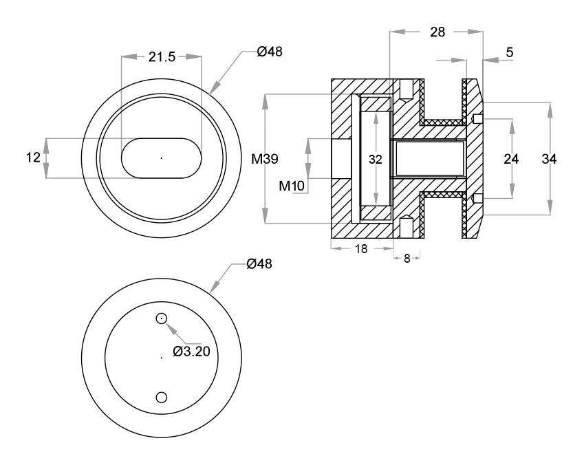 Fixation ponctuelle ronde fi 48 mm pour fixation de verre dans les balustrades inoxydables — conçue pour le montage sur surfaces planes. Fabriquée en acier inoxydable AISI 304 finition satinée, elle allie esthétique et haute résistance à la corrosion. Grâce au système de serrage à clé (trous de boulon Ø 3,20 mm), elle assure une fixation sûre et réglable des verres d'épaisseur de 8 à 16,76 mm.