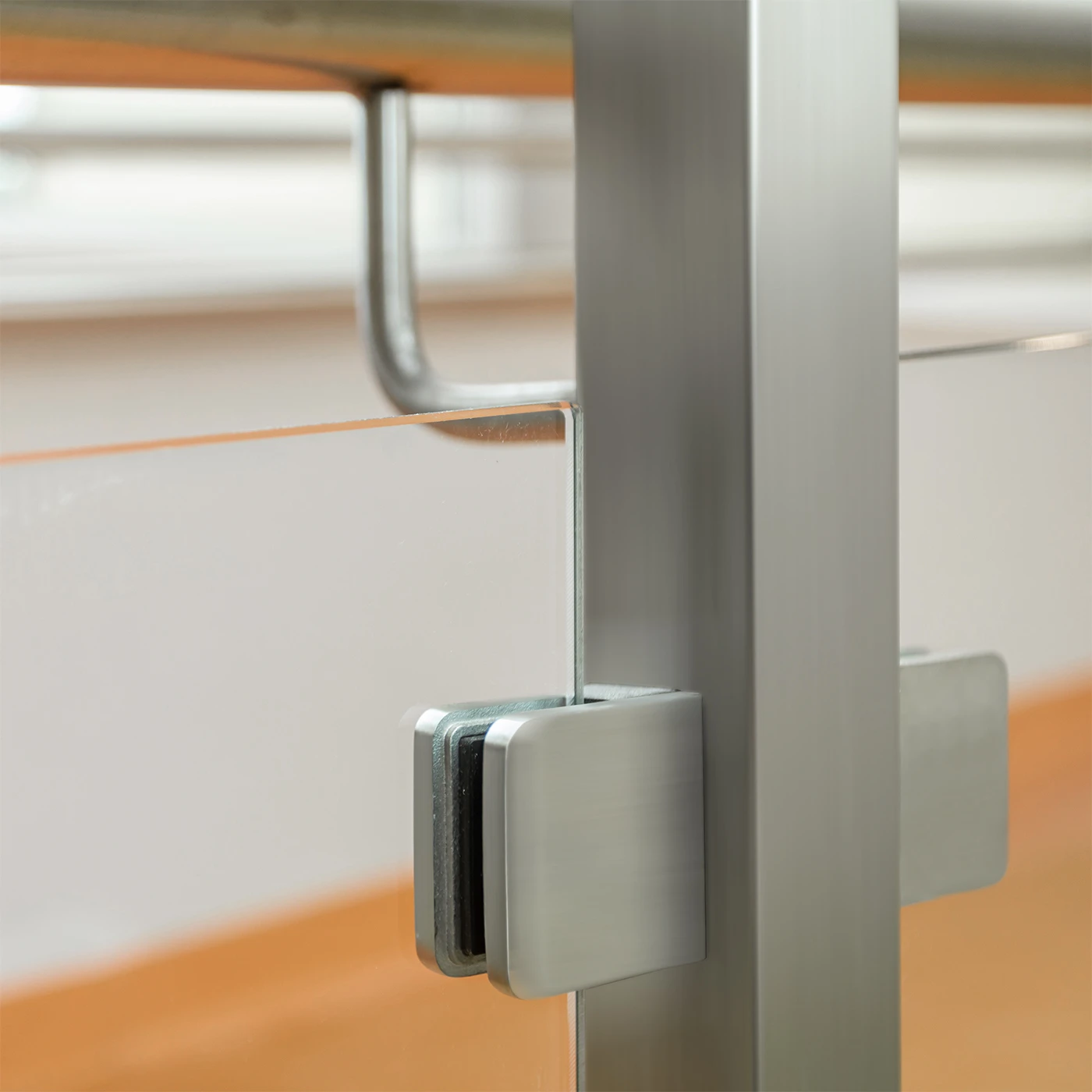 Le support est destiné aux systemes a surface de montage plane — poteaux rectangulaires, profilés en acier et murs. La forme compacte 45×45 mm offre un aspect discret, tandis que la finition miroir brillante s'harmonise avec les aménagements intérieurs modernes. Grâce a la plage d'épaisseur de verre 6–10,76 mm, il est compatible aussi bien avec les panneaux trempés simples qu'avec le verre feuilleté de type VSG. Le montage consiste a visser le support sur le support de fixation et a glisser le panneau dans la fente avec le joint — rapide et sans outils spécialisés.