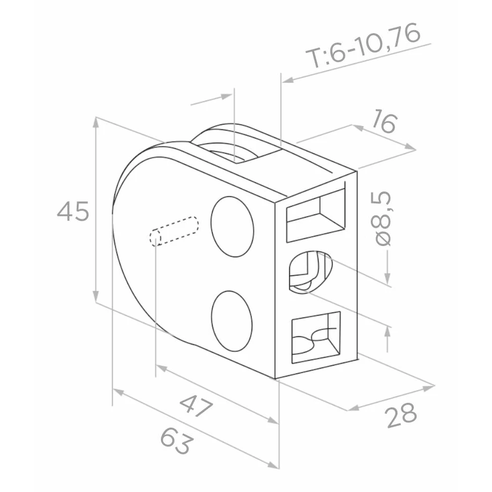 Support pour verre arrondi aux dimensions 63×45×28 mm, conçu pour le montage de panneaux en verre d'une épaisseur de 6 à 10,76 mm sur des surfaces planes. Fabriqué en acier inoxydable AISI 304 avec une finition satinée — un choix idéal pour les garde-corps en verre élégants, les aménagements intérieurs et les systèmes de cloisons dans les bâtiments commerciaux et résidentiels.