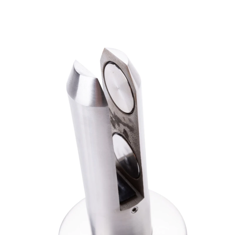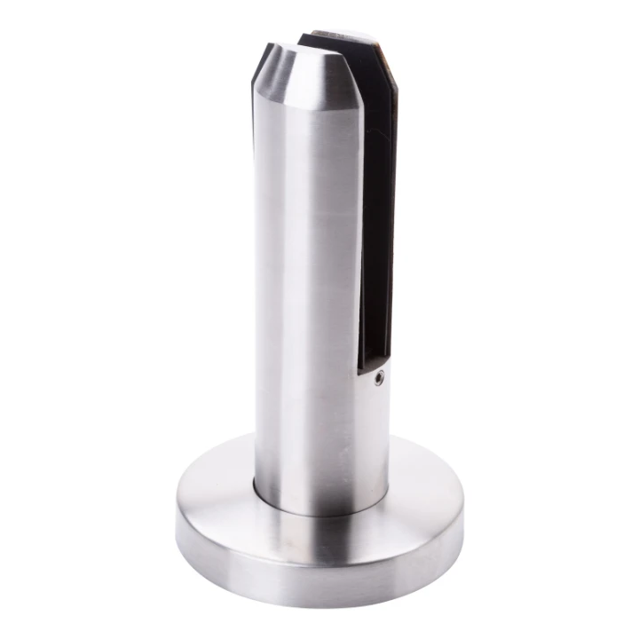 La partie supérieure du support est équipée d'une tige fendue avec deux mâchoires de serrage, entre lesquelles le panneau de verre est inséré. À l'intérieur de la fente se trouvent des joints en caoutchouc qui maintiennent fermement le verre et le protègent contre les rayures. Grâce à cette conception, la structure transfère efficacement les charges et garantit la sécurité d'utilisation.