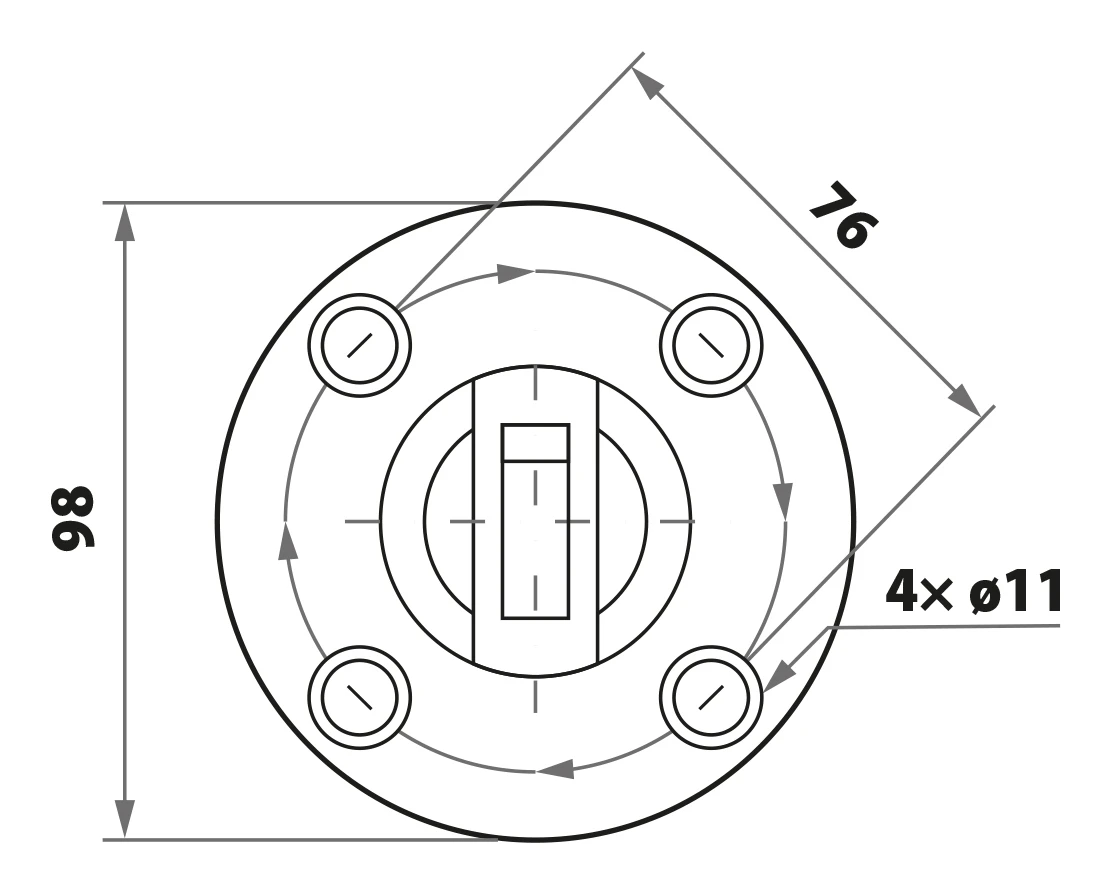 La base de montage ronde dispose de 4 trous de fixation d'un diamètre de ø11 mm répartis sur un cercle d'entraxe de 76 mm, ce qui permet un vissage sûr et symétrique sur le support. Le cache-vis fourni dans le set recouvre les têtes de vis, offrant un aspect élégant et soigné.