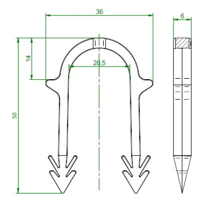 Technische parameters: de totale lengte van de nietje bedraagt 50 mm en de diameter van de buishouder is 20 mm. De U-vormige constructie met karakteristieke verankering zorgt voor een stevige verankering in het isolatiemateriaal en een stabiele grip op de buis.