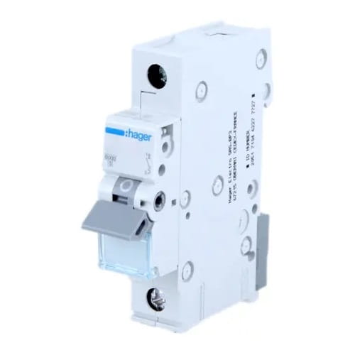 Disjoncteur de surintensité B 6A 1P 6kA MBN106E HAGER Également connu sous le nom de disjoncteur, il s'agit d'un élément clé des systèmes électriques qui interrompt la continuité d'un circuit lorsque le courant dépasse le niveau de sécurité pour le circuit.