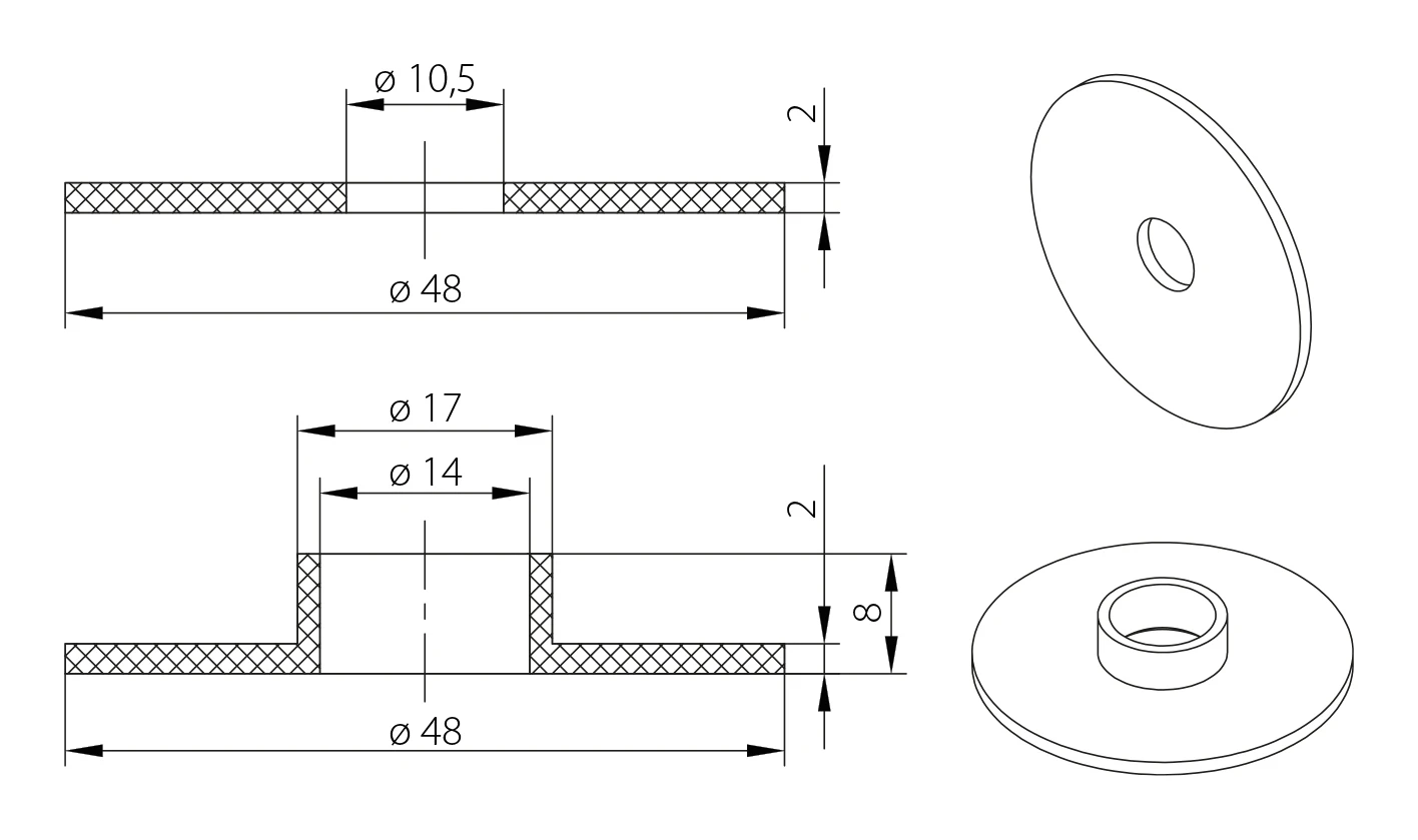 Joints en caoutchouc de serrage pour fixations ponctuelles fi 50 mm lot de 2 pcs (plat + collerette)