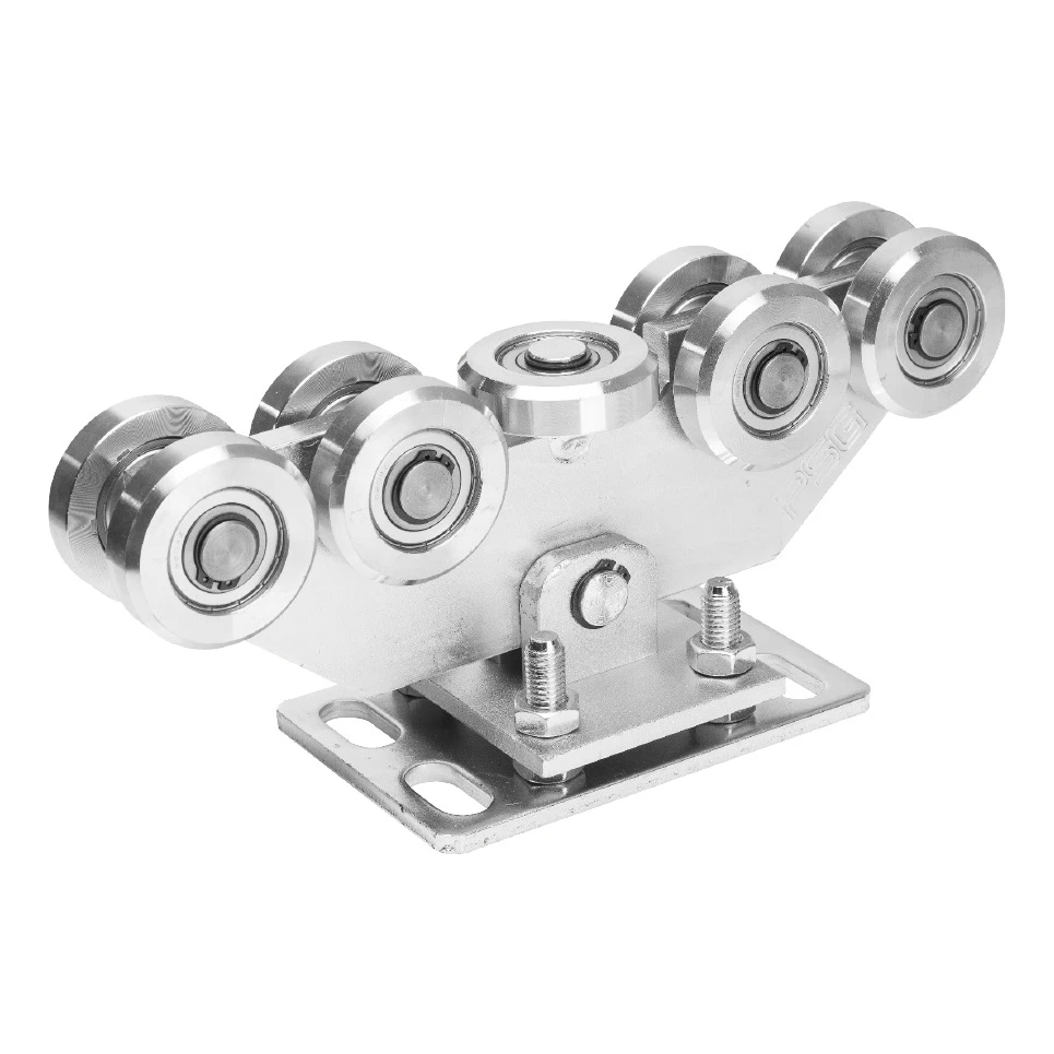 Le chariot de roulement équipé de 9 galets en acier à roulements assure un coulissement particulièrement fluide et silencieux du portail. La construction avec réglage en hauteur par vis permet un positionnement précis du portail par rapport au niveau, ce qui se traduit par une répartition uniforme de la charge et une usure réduite des galets. Chaque chariot est adapté à un rail de dimensions 80×80×5 mm et supporte une charge allant jusqu'à 1000 kg.