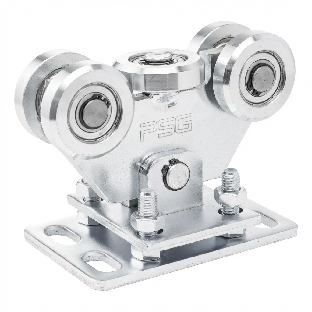 - Chariot roulant – 2 pcs – chariot oscillant avec 5 galets métalliques (dont un galet horizontal), avec réglage en hauteur par vis, conçu pour rail 70×70×4 mm